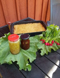 Här kommer en bild på resultatet av första skörden av rabarber och rädisor.